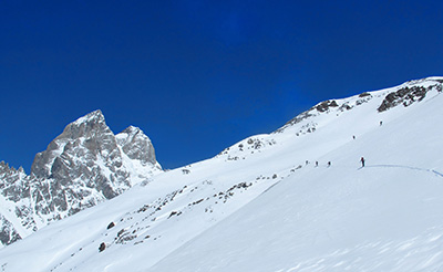Von Adischi führt der Weg zum Ende des Tals bis zum gewaltigen Eisbruch des Adischi-Gletschers, der vom Hauptkamm des großen Kaukasus herabfließt. Von dort geht es weiter Richtung Tetnuldi zum Tvimbasheri Gipfel (3.166 m) . Je nach Verhältnissen weiterer Aufstieg bis 3400 m oder direkt über eine schöne Abfahrt mit breiten Hängen bis zum Dorf Adishi. Von hier: Autotransfer nach Ushguli. Übernachtung in Ushguli (ca. ↑1320 m↓1320 m)