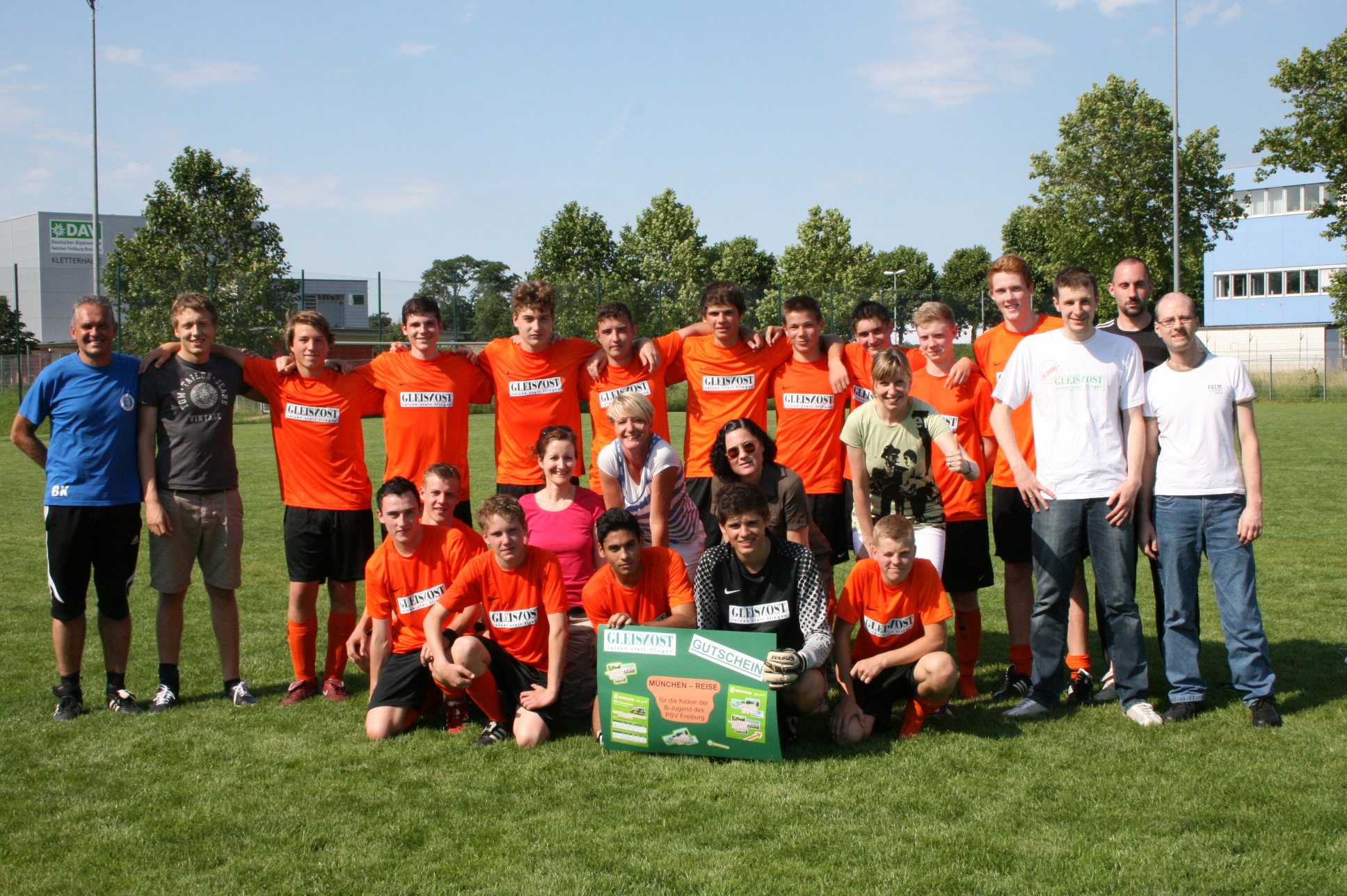 Am 16. Juni fanden sich einige unserer Mitarbeiter beim Bezirksliga-Heimspiel gegen die Mannschaft der Eintracht Freiburg ein. Das Spiel entschieden „unsere“ Jungs mit 1:0 für sich. Anschließend übergab das Gleisnost-Team der Mannschaft einen Gutschein für eine Reise nach München, an Bord unseres neuen Spitzen-Angebots „MeinFernbus“ – großer Applaus bei den Spielern war die Folge. Trainer Bernd Kremp meinte dazu: „Seit 1982 bin ich Trainer einer Fußballmannschaft, aber so ein Geschenk bekam eine meiner Mannschaften noch nie. Das muss erst einmal verdaut werden.“